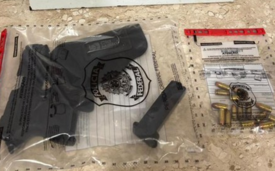 Durante a vistoria, foi localizada no interior do automóvel uma pistola calibre .380, municiada, sem a devida autorização legal para porte.